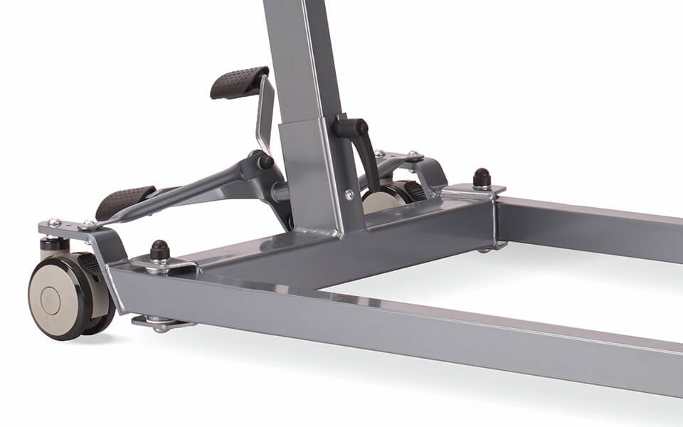 Las patas se abren y cierran presionando el pedal ergonómico con el pie para conseguir una mayor o menor anchura de la grúa.