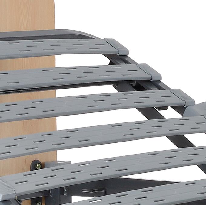Lecho de 4 planos y 3 articulaciones. Lamas de plástico. Tacos de sujeción de lamas fijos de polietileno.